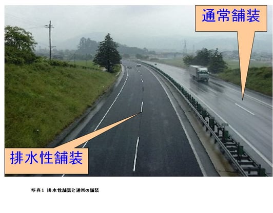 下の写真1は、雨天時の通常舗装と排水性舗装の比較写真です。